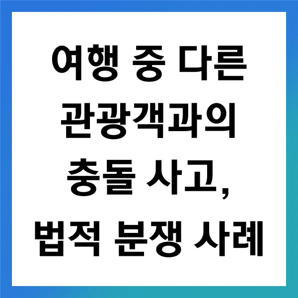 여행 중 다른 관광객과의 충돌 사고는 다양한 상황에서 법적 분쟁으로 발전 할 수 있습니다. 관광객 사이의 신체적 충돌 , 재산 손해 , 그리고 문화적 오해 가 그 대표적인 예입니다. 이러한 분쟁은 여러 가지 요인에 의해 발생하며, 분쟁의 유형도 다양합니다.