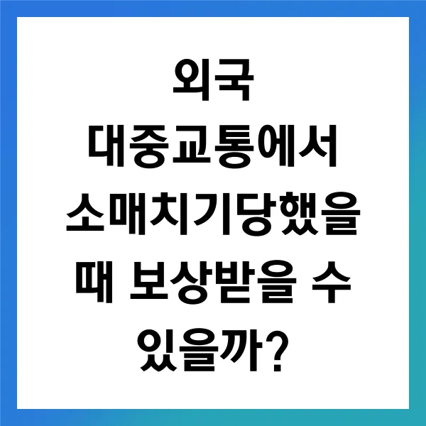 해외 여행 중 외국 대중교통을 이용하다 소매치기를 당하는 경험은 매우 불쾌하고 스트레스가 많은 상황 입니다. 이러한 피해를 입었을 때, 과연 어떻게 대처해야 하는지에 대한 정보는 필수적입니다. 본 글에서는 소매치기 피해를 입었을 때의 대응 방법과 보험 청구 절차, 대사관 및 영사관의 지원 서비스에 대해 상세히 안내드릴 것입니다. 또한, 이러한 상황을 예방하기 위한 팁도 함께 제공 하여 향후 여행 시 더욱 안전한 환경을 마련할 수 있도록 돕고자 합니다. 이런 정보들을 통해 피해 상황에서도 보다 침착하게 대처할 수 있는 방법을 배워보시기 바랍니다.
