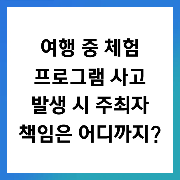 결론적으로, 여행 중 체험 프로그램에서의 사고는 주최자에게 중대한 법적 책임을 부과 합니다. 참가자의 안전을 최우선으로 고려해야 하며, 그에 따른 법적 책임을 정확히 이해하고 준수하여야 합니다. 이 모든 사항들은 주최자가 프로그램을 운영함에 있어 반드시 숙지하고 있어야 할 부분입니다. 체험 프로그램의 성공 여부는 참가자들의 안전과 직결되며, 주최자의 철저한 준비와 관리가 이를 뒷받침할 것입니다.