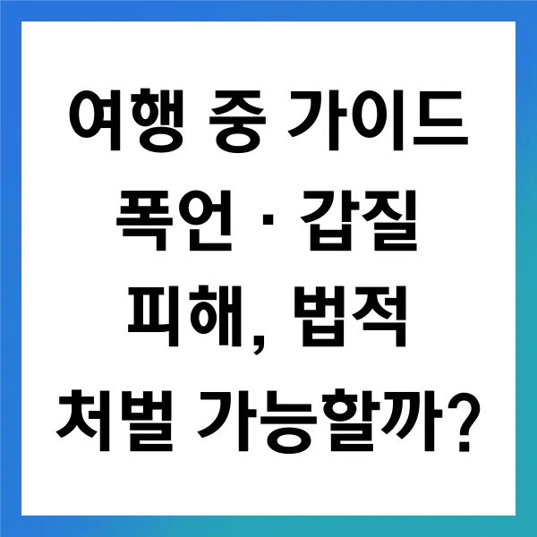 결론적으로, 여행 중 가이드의 폭언이나 갑질에 대해서는 법적으로 명확히 처벌할 수 있는 근거가 존재합니다. 피해자는 적절한 증거 수집과 법적 조치를 통해 자신의 권리를 보호받을 수 있으며, 필요한 경우 전문가의 도움을 받는 것이 필수적입니다. 이러한 과정이 피해자의 정신적 안정 과 더불어, 유사 사건의 재발 방지에도 기여할 수 있음을 잊지 말아야 합니다 .